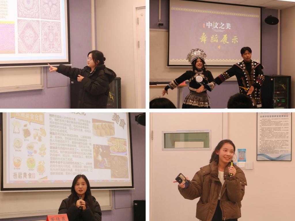 来自土家族的同学向大家展示了土家族的吊脚楼特色民族建筑,哈尼族同学带大家一同游历长街宴、元阳梯田等文明奇观,壮族同学分享了三月三歌节、对山歌、刘三姐等故事,布依族同学向大家展示了干栏石屋等民族传统建筑,瑶族的同学将瑶族舞蹈、盘王节等颇具民族特色的内容以视频的方式呈现在大家眼前。最后,彝族同学介绍了俐侎人的相关文化。
