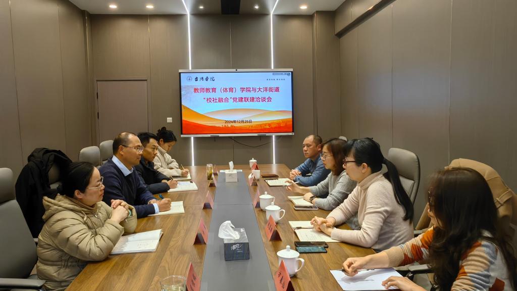为进一步加强基层党组织建设,整合学校、社区优势资源,促进学校与地方互助共赢,12月25日下午,教师教育(体育)学院与大洋街道学文社区开展“校社融合”党建联建洽谈会,大洋街道组织委员娄敏一行四人参加会议,学院党委书记林辉杰,辅导员阎宝莹、徐薇、屈佳妮、朱浩楠参加洽谈会。