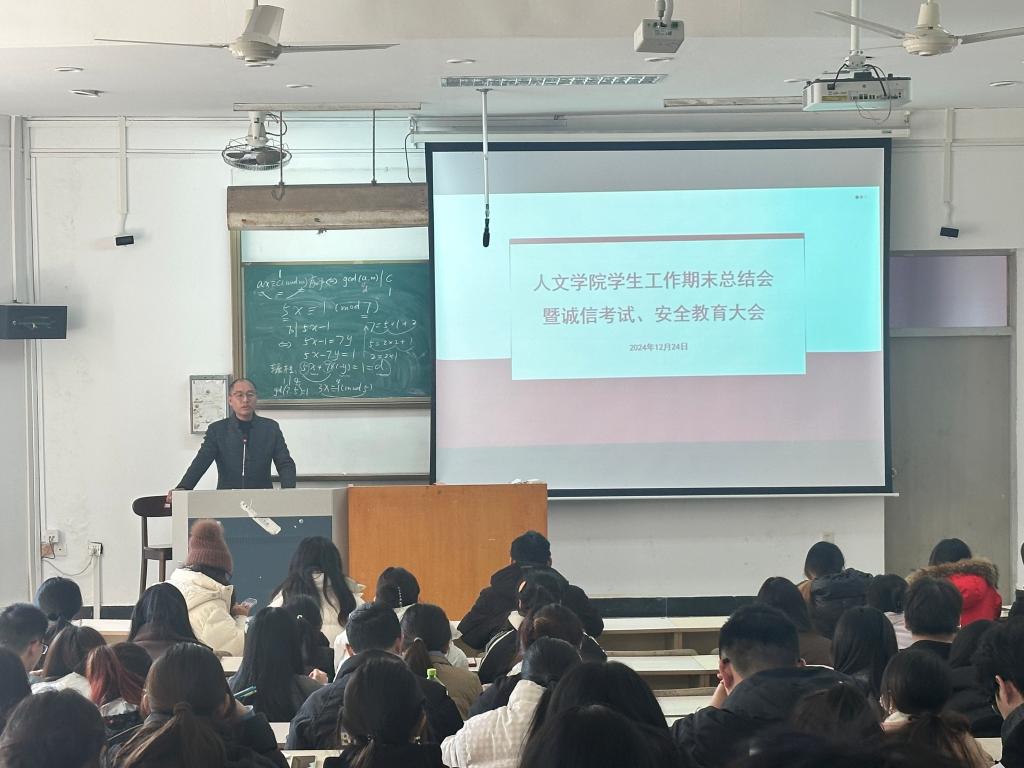 12月24日中午,人文学院召开学生期末工作总结会暨诚信考试、安全教育大会,学院党委副书记林军辉出席,全体辅导员、各班班长团支书参加。