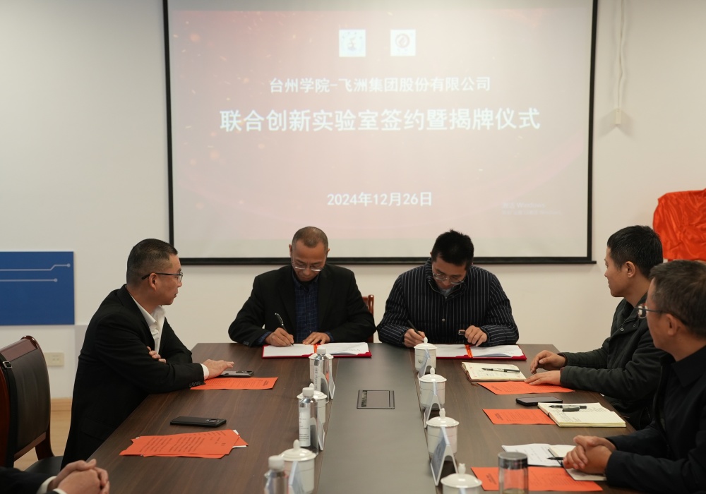12月26日上午,台州学院-飞洲集团举行校企联合创新实验室签约仪式在智能制造学院会议室举行。飞洲集团股份有限公司董事长丁忠海、总裁邹志波、人资部经理盛昌平、研发部经理王小新和郭瑞、智能制造学院院长陈鹏展、副院长林树森、台州学院温岭研究院执行院长王立标及博士代表出席。仪式由台州学院智能制造(航空工程)学院党委书记李友富主持。