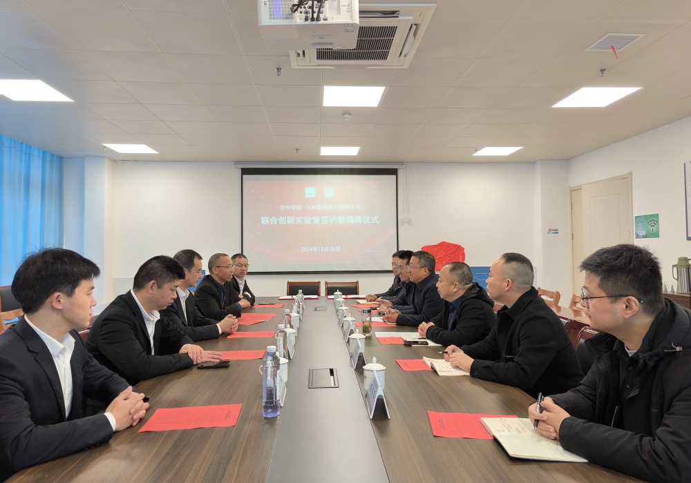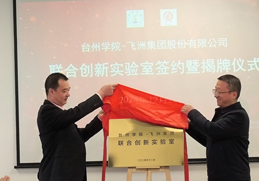会上,陈鹏展和丁忠海为台州学院-飞洲集团联合创新实验室揭牌。