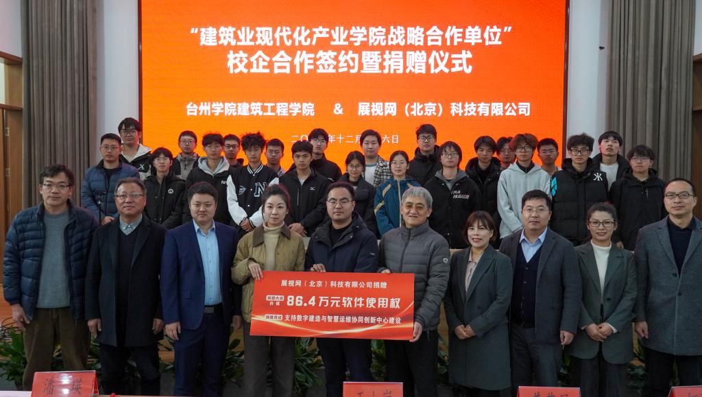 12月26日,台州学院建筑工程学院与展视网(北京)科技有限公司(以下简称“展视网”)举行了校企合作签约暨捐赠仪式。此次合作不仅标志着双方在深化产教融合、促进建筑行业现代化方面取得了重要进展,也为未来共同推动产业发展奠定了坚实基础。