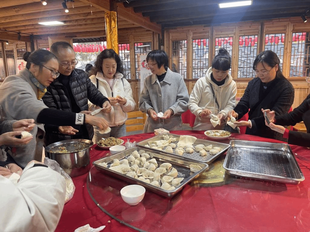 结束参观后,大家来到了当地的农家乐,大家围在一起开展迎新年包饺子活动,男女同胞们纷纷撸起袖子,大显身手,比拼手艺,现场欢声笑语,其乐融融。