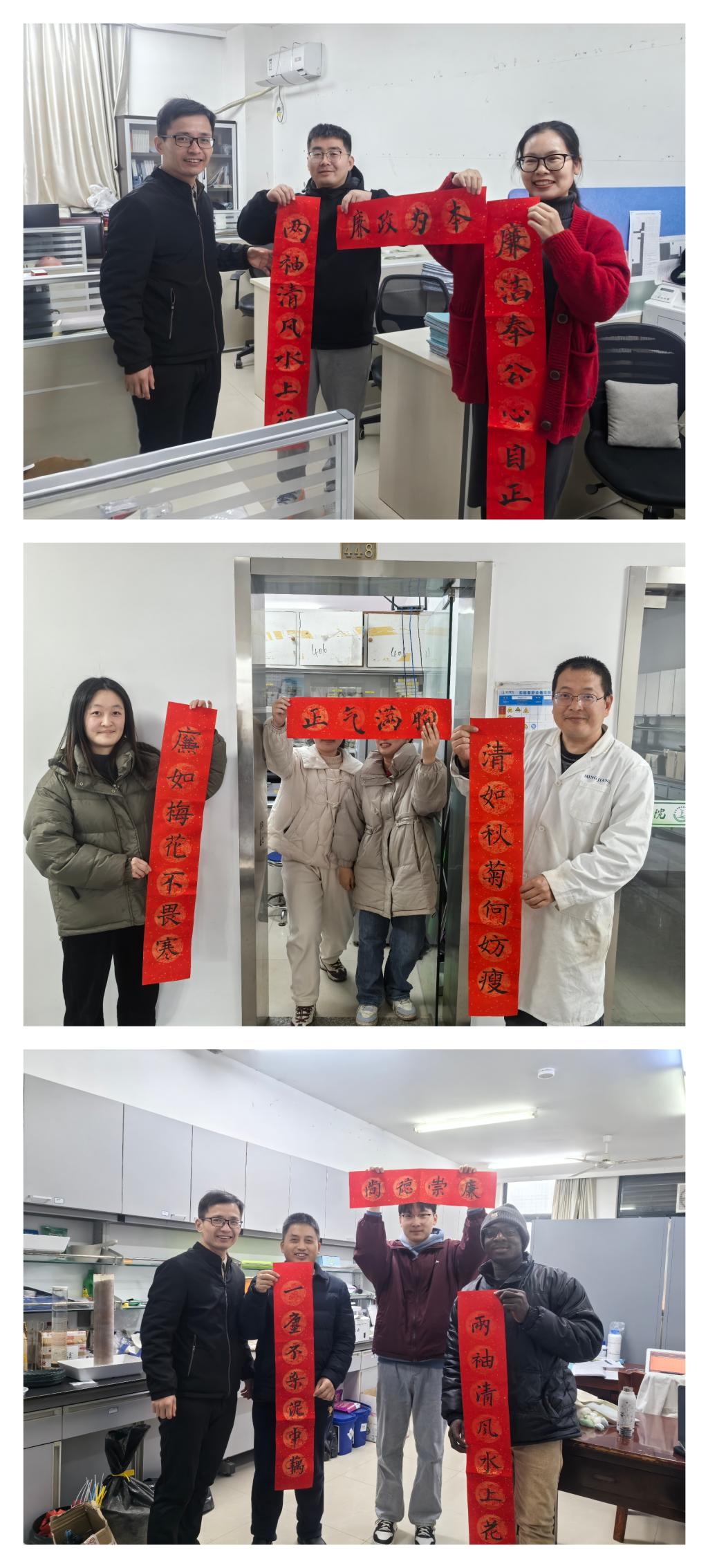 值得一提的是,本次比赛突破性地融入“清廉”主题,让传统春联摇身一变,化作寓意深刻的春“廉”。同学们才思泉涌,巧妙地把廉洁文化融入联句之中。学院党委副书记、纪委书记翁添富携全体纪委委员,带着满含心意的“廉洁春联”走访学院各办公室、实验室“上门送廉”。每送出一副春联,送去的不仅是对新岁的热忱祝福,更是一份沉甸甸的廉洁嘱托,让清风正气于无声处扎根滋养。