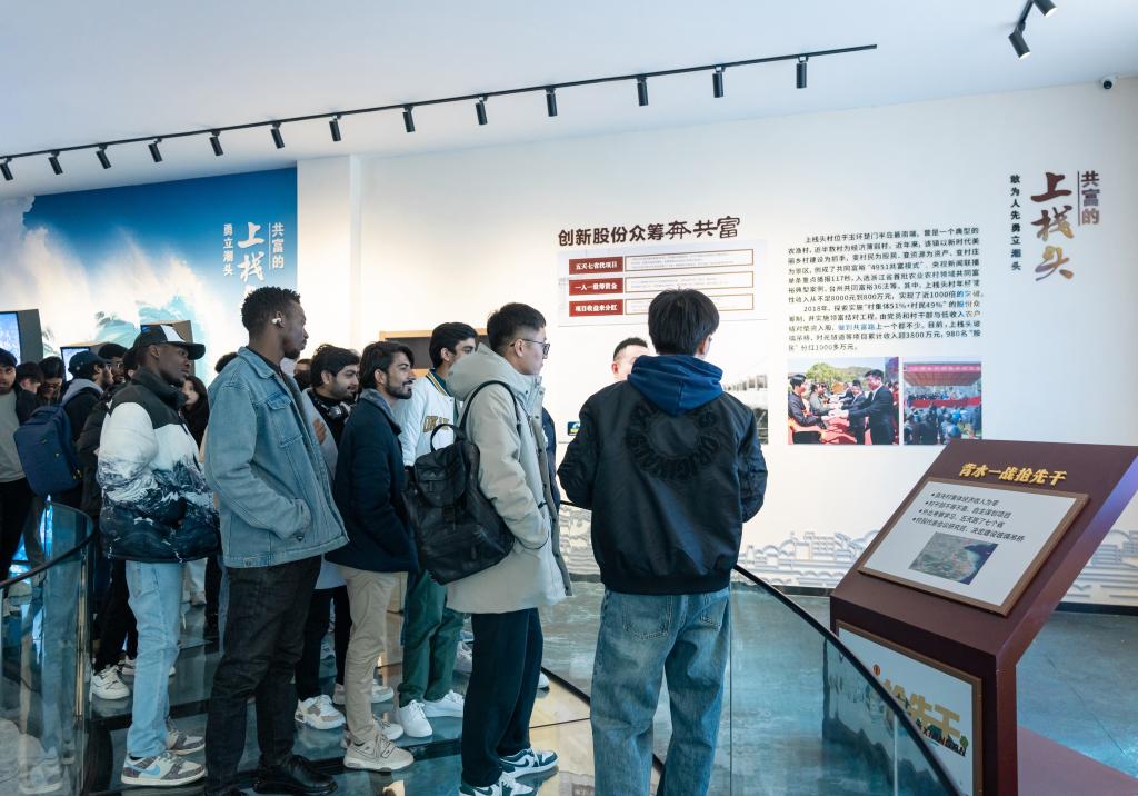 上午,师生一行首先来到玉环上栈头村共富学院。在这里,工作人员通过生动的讲解和详实的资料展示,向国际学生讲述了上栈头村的发展历史。从曾经的小渔村到如今的美丽乡村典范,村庄的每一步蜕变都让这群“洋霞客”惊叹不已。他们深入了解了乡村经济“51+49”发展模式,对特色产业带动乡村振兴的创新路径表现出浓厚兴趣,纷纷就产业规划、村民增收等问题与工作人员展开交流。