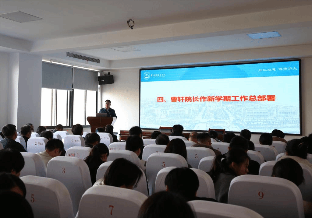 曹轩院长在会上作了新学期工作总部署。他指出,2025年是学校“升格大学”决战重要之年,是“十四五”“十五五”承上启下之年,学院全体要拧成一股绳,全力以赴。他还强调,课堂是教学的主阵地,教师要切实提高课堂教学质量,提升学院的整体实力和竞争力。