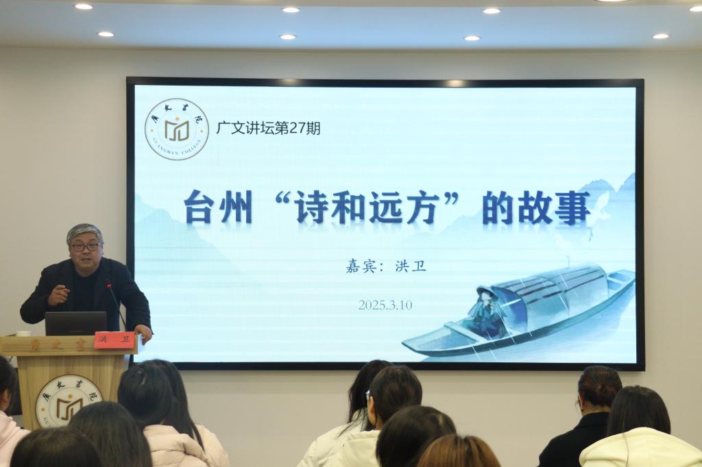 3月10日晚,广文书院第27期广文讲坛如期举行。台州市政府研究室二级调研员、决策咨询委员会秘书长洪卫以“台州诗和远方的故事”为主题,为师生们带来了一场精彩的文化讲座。广文书院院长胡正武、副院长金旭球、导师郭文平与部分学生一同聆听。