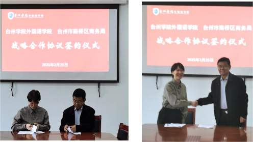 随后,双方在洽谈中就具体的合作细节进行了深入交流。王刚就促进商务局涉外项目与外国语学院教学资源的高效对接,共同举办商务论坛和电商领域的合作,建立“政府+高校”的长效合作机制、挂图推进,进行订单式培养等提出建议。副院长卢立伟就加强外语人才培养与国际商务实践的结合,提升学生的实践能力和就业竞争力,有效构建跨境电商人才培训体系等提出建议。在双方达成共识后,王刚与应宛妤代表双方签署《台州学院外国语学院与路桥商务局合作框架协议》。