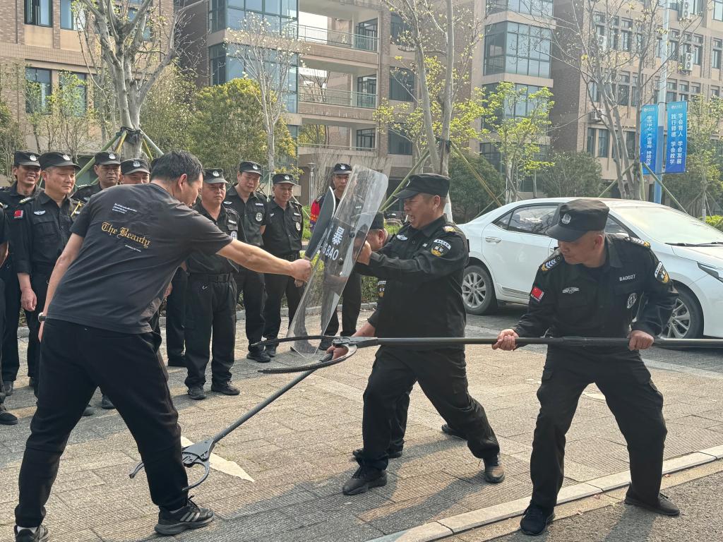 培训中两位教官重点讲解了防爆毯、防刺服、防刺手套、齐眉棍、捕捉网、盾牌、抓捕器等器械的使用,以及队形队列训练。随后一场预设的紧急情况在校园内悄然拉开序幕。一名“暴恐歹徒”,手持凶器企图闯入校园,保安队员临危不乱,利用防暴装备,合力将歹徒制服。之后保安队员三人一组,轮番实战。本次防暴演练严格贯彻“实战引领、训战结合”原则,通过全要素、全流程的实兵对抗,全面检验校园安保体系的应急响应能力。