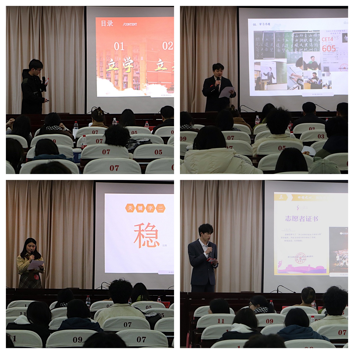 活动伊始,主持人向到场师生致以热烈欢迎,并简要介绍评选流程。本次评选分为“个人风采展示”与“现场投票”两大环节,16名候选人依次登台,通过精心准备的PPT与演讲,多维度展现成长足迹。在限时三分钟的展示中,候选人以饱满的热情讲述奋斗故事:有的专业成绩蝉联年级榜首,获国家级奖学金;有的深耕教育实践,带领团队开展乡村支教项目;还有的活跃于校园文化舞台,策划校级活动十余场……他们以扎实的履历与昂扬的姿态,生动诠释了“澡身浴德,修业及时”的校训精神,赢得现场阵阵掌声。