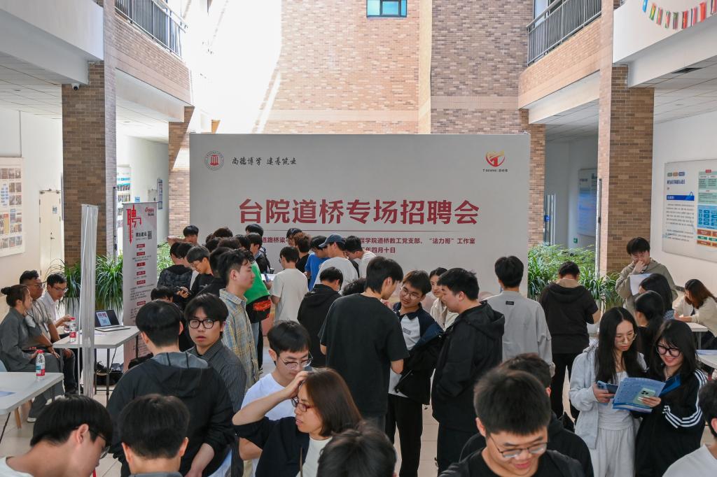为做好2025届道路桥梁与渡河工程专业毕业生就业工作,建筑工程学院道桥教工党支部“法力哥”党支部书记工作室充分发挥支部战斗堡垒作用,在前期大量“访企拓岗”和“一对一”就业帮扶基础上,4月11日,在建工楼一楼大厅举办了“台院道桥专场招聘会”。学院党委副书记汤爽、“法力哥”工作室负责人林法力,就业辅导员任仲佩以及2025届道桥毕业生参加。