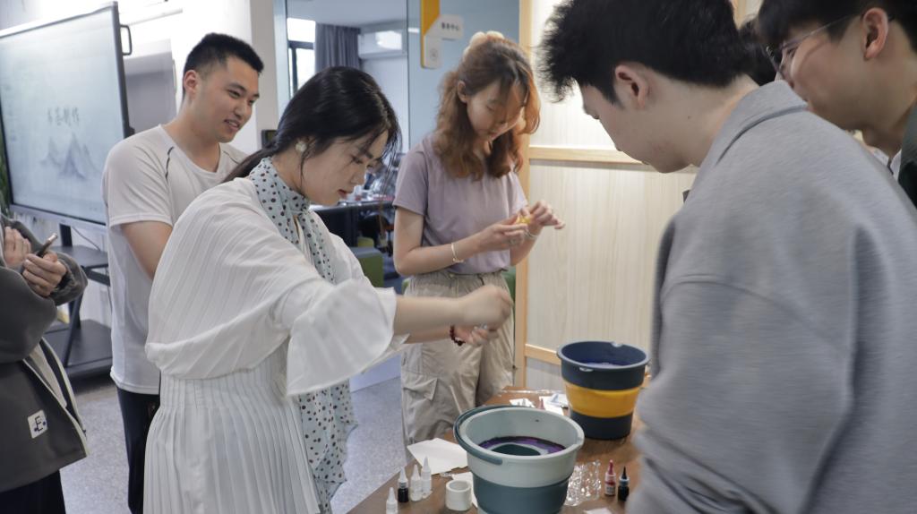 在世界读书日,心湖书院以非遗大漆书签制作为载体,将传统工艺与阅读文化深度融合。活动中,同学们从选材到设计全程亲历非遗技艺:各自选取、调配喜欢的大漆色彩,通过调漆棒在水中轻搅,形成如水墨晕染般的自然纹路;随后尝试多种浸染技法:或持书签“平入”水面,任漆色渐次渗透;或“斜入”轻旋,塑造螺旋状肌理;更有学子以“波浪法”左右轻摇,使漆色层叠如烟霞。