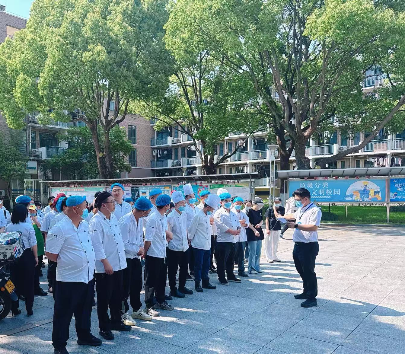 演练中,食堂模拟火灾突发场景。工作人员发现“火情”后,立即呼喊并按下手动报警按钮;管理人员迅速拨打安保电话,启动应急响应机制;员工第一时间利用灭火器、消防栓开展初期火灾扑救。疏散指令下达后,食堂员工与安保人员在通道口引导人员采取“捂住口鼻、低姿弯腰”的正确姿势,沿预定路线有序撤离,对行动不便者提供协助,确保全员安全疏散。疏散至安全区域后,各食堂迅速集结,负责人清点人数并向指挥组报告。与此同时,安保人员携带专业灭火设备赶赴“火灾”现场,熟练运用灭火器材扑灭“大火”。演练还模拟人员受伤场景,医疗救护小组及时对伤员进行初步救治,并将重伤员送医,全流程检验应急救援能力。