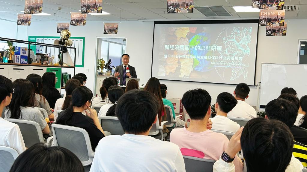 5月14日,商学院金融学专业师生80余人走进中宏保险,开展行业深度调研。同学们通过实地走访,了解当前台州人寿保险的发展现状、经营范围、保险产品,调研保险公司的经营战略、营销方式、产品销售情况,探索保险业当前面临的挑战、未来发展趋势及人才需求。中宏保险台州中心支公司负责人任敏给学生带来了一场内容丰富的就业指导讲座。他介绍了中宏保险的前世今生,并从保险的起源、保险的发展、台州保险的市场分析、职业生涯发展思考四个方面与同学们展开深度交流。他提出,保险业正在经历从人力爆发到结构性调整的规模性成长阶段,面对全球从“乌卡时代”(VUCA)向“巴尼时代”(BANI)的演变,建议同学们培养“反脆弱”思维,主动拥抱不确定性。