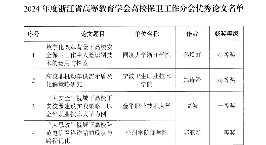 在2024年度优秀论文层层评选中,我校教师邬亚新撰写的论文《“大思政”视域下高校防范电信网络诈骗的现状与路径优化》获评2024年度浙江省高保学会优秀论文一等奖,凸显了我校在校园安全治理与教育领域的持续深耕。