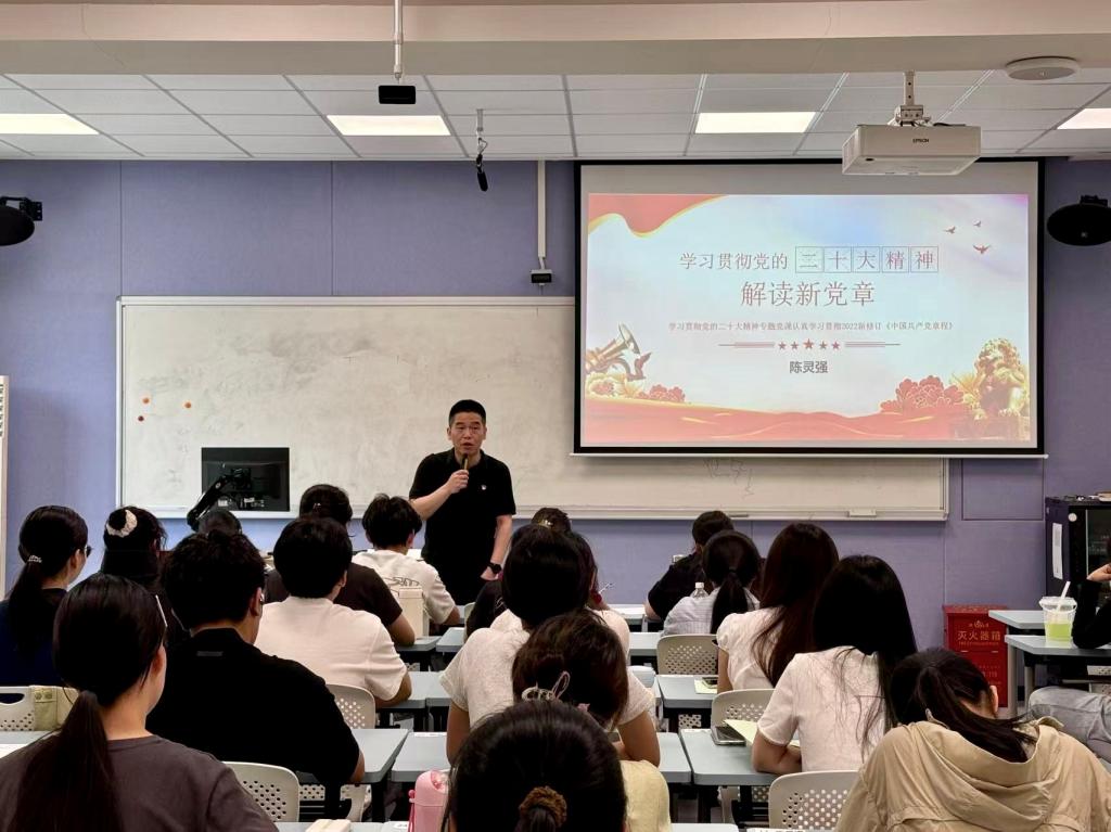 开班典礼后,陈灵强给学员讲授题为“学习贯彻新党章 勇担时代新使命”的党课。党课结合当前国际形势展开论述,通过剖析中美经贸博弈与地区冲突案例,生动阐释中国式现代化道路的优越性,引导学员深刻认识“两个确立”的决定性意义。陈灵强书记强调,党章修订是适应新时代党建需要的战略性举措,既是贯彻创新理论的根本要求,更是推进强国建设的制度保障。针对青年思想特点,陈书记提出三点期望:一要能够冲破信息茧房,扩大知识领域,主动拓宽国际视野,在多元思潮中筑牢信仰根基;二要厚植家国情怀,勇于奉献,以党员的标准严格要求自己,以实际行动践行入党的初心;三是要锤炼过硬本领,发挥模范带头作用,影响带动周围的同学。
