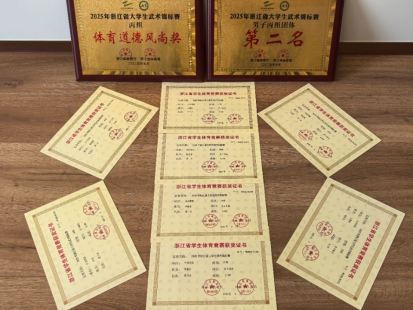 5月20日至24日,2025年浙江省大学生武术锦标赛(乙丙组)在嘉兴平湖市体育中心擂响战鼓。由教师教育(体育)学院体育教育专业学子组成的台州学院武术队,在领队覃宇德、教练樊坤的带领下,与全省高校武术健儿同台竞技、激烈交锋,最终斩获佳绩,载誉而归。