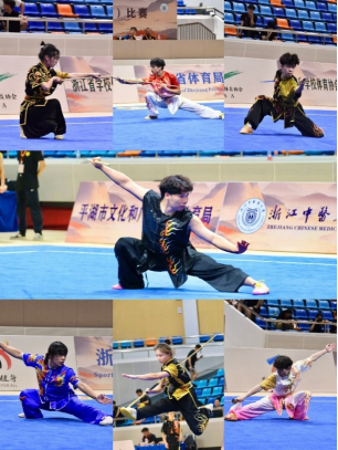 赛场上,运动员们步伐如松,身法似电,拳掌间劲力吞吐,招式里气韵流转尽显中华武术的刚柔之道。刀光起落如银龙破空,剑影翩跹似青鸾回舞,长棍横扫挟风雷之势,一招一式将传统武术的形神兼备、内外兼修演绎得淋漓尽致。台州学院武术队的卓越表现生动诠释了我校学子迎难而上、锐意进取的拼搏精神,完美体现了我校民族传统体育“以武修德、以德砺行”的文化精髓,在省赛舞台上书写了属于台州学院的武术华章。
