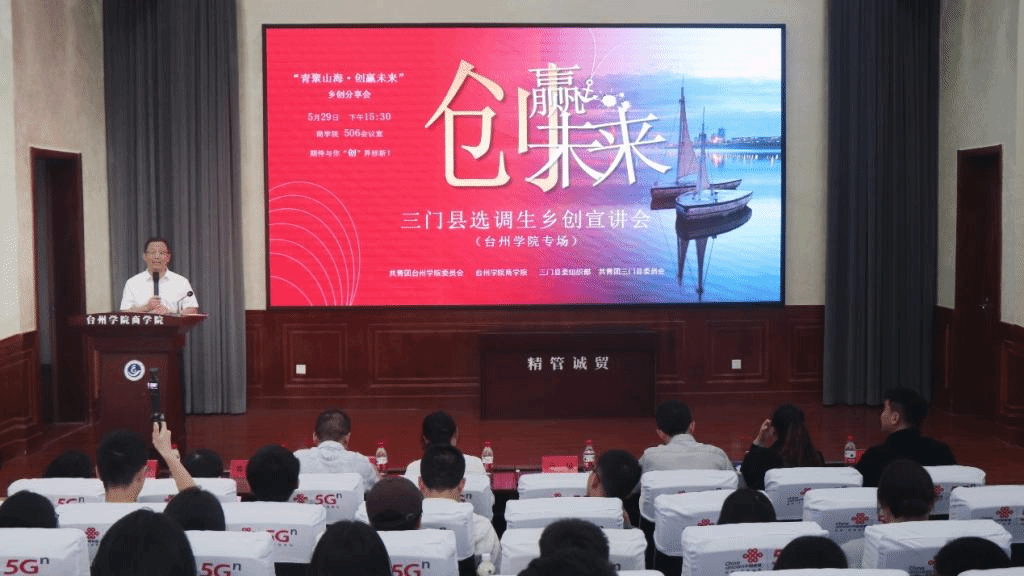 5月29日,商学院506报告厅气氛热烈,“青聚山海·创赢未来”三门县选调生乡创宣讲活动在此隆重举行。本次活动由共青团台州学院委员会、台州学院商学院联合三门县委组织部、共青团三门县委员会共同主办,由商学院龙潭书院与三门县选调生“星耀班”联合承办,旨在响应国家乡村振兴战略,搭建青年人才返乡创业交流平台,深度融合地方乡创资源与学院学科优势。校团委书记潘垚,商学院党委书记马斌,三门县团委书记陈威屹,三门县委人才办专职副主任、干部科科长柯名群等嘉宾应邀出席活动。