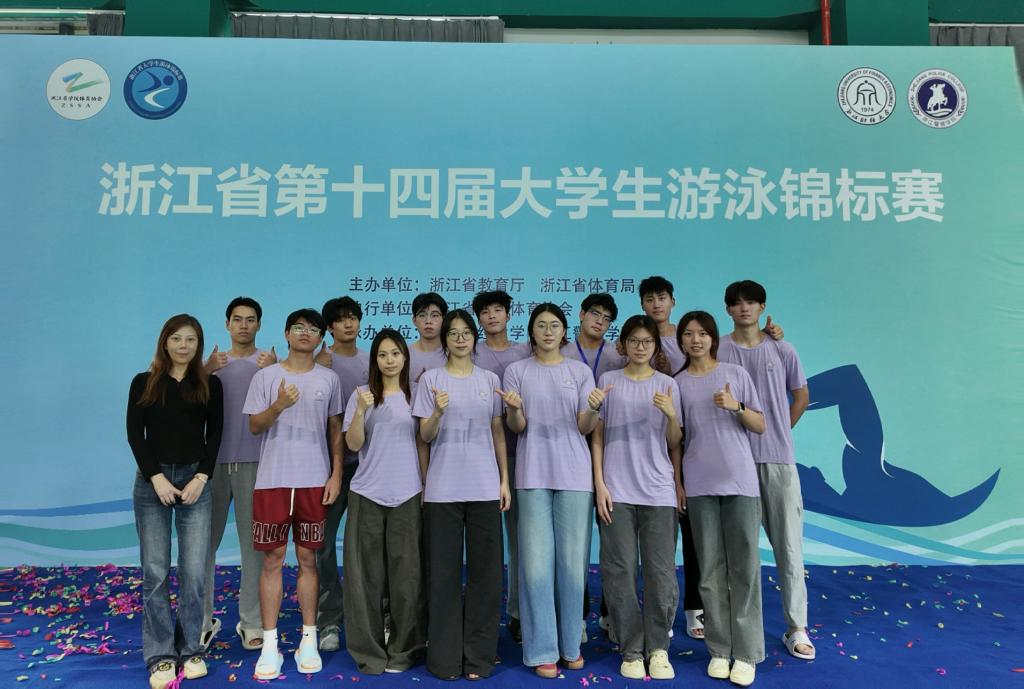 2025年浙江省第十四届大学生游泳锦标赛于5月28日—6月1日在湖州长兴百叶龙体育中心游泳馆举行。此次比赛共有40多所高校参赛,我校游泳队在领队应孜老师、教练员吴薇老师的带领下参加了本次比赛。