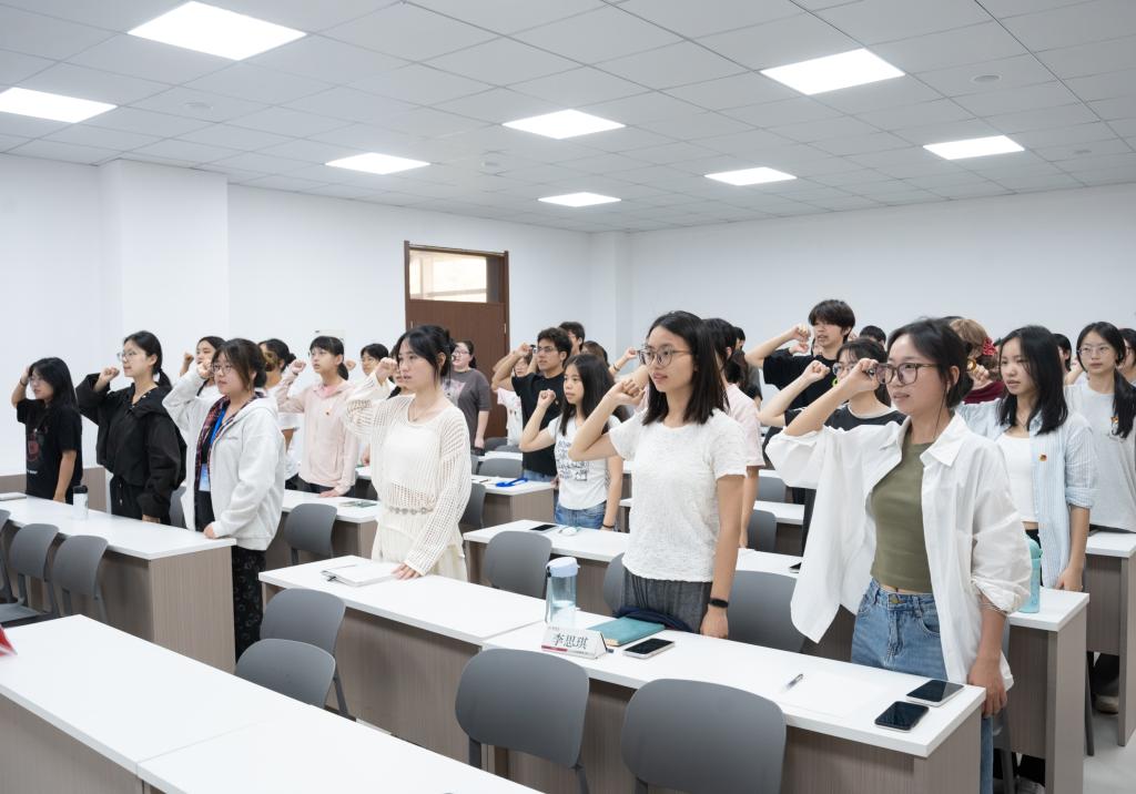 大会在激昂的团歌声中拉开帷幕。姚卓琳宣读新团员名单,并对学院15名新团员表示祝贺。随后,高阳为新团员颁发团章、佩戴团徽,一枚枚团徽闪耀,承载着责任与使命。新团员代表24药学班李勇、老团员代表23生物制药班邱佳豪分别发言,表达了将继续坚定信念、奋勇前行的决心。全体新团员在庄严宣誓中,许下为共产主义事业奋斗的铮铮誓言。