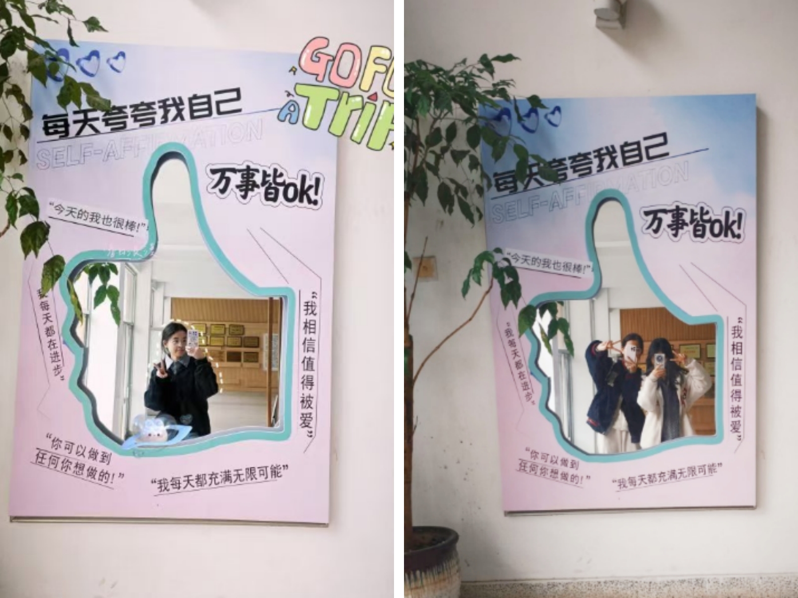 3月开展的“自我宝藏·闪耀光芒”自我肯定夸夸镜活动,通过在夸夸镜前自拍鼓励学生发掘自身优点,强化积极自我认知;5月25日“心音相印·乐动时光”草坪音乐会暨完美声音大赛,则以音乐为媒介,让学生在初夏夜色中释放情感压力,收获心灵共鸣。