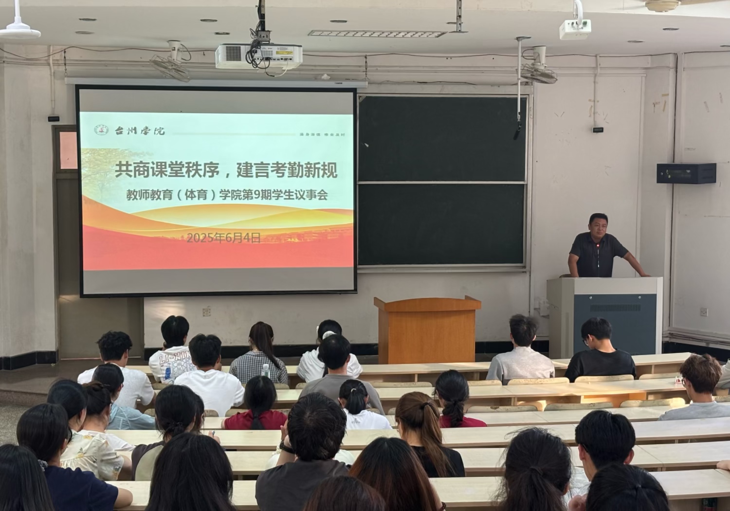为进一步强化学风建设,规范课堂教学管理,6月4日下午,教师教育(体育)学院于A5教室召开了第9期学生议事会,本次会议以“共商课堂秩序,建言考勤新规”为主题。会议由学院党委副书记吴磊主持,辅导员朱浩楠、朱佳婧参加会议,大一至大三各班班长、学习委员参与研讨。