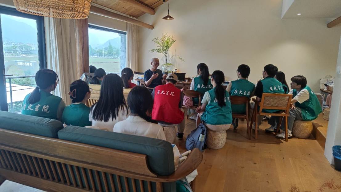 穿过阡陌稻田,在咖啡馆的座谈中,桃渚镇党委委员钱盈盈对学生们的到来致以诚挚欢迎,并简要介绍桃渚镇。镇宣传干事陈文婷就桃渚三张金名片——全国重点文物保护单位桃渚军事古城、国家级风景名胜区桃江十三渚、国家地质公园武坑峰林展开详细介绍。台州市文化特派员陈永君则深入分析了基层文化阵地提升和文化活动,全面解读了芙蓉村的建设规划。通过实地走访、专业讲解和深入交流,学生们深刻认识到乡村文化振兴不是一朝一夕,明确了青年在文化传承和乡村振兴中的责任担当。