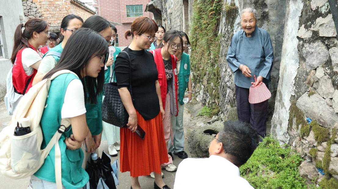 学生们在村党总支委员黄海剑的引导下深入探访芙蓉村。“山水秀芙蓉,古今享韶华”的村落风貌令人赞叹。在村委会,学生们切身感受“小事不出村,大事找干部”的惠民政策,聆听千年村史变迁,了解共富蓝图规划,深刻学习孝贤文化和先辈的奋斗精神。漫步村中,宋明古建筑诉说着岁月沧桑,老年协会洋溢着幸福氛围,“共富工坊”里,老人忙碌工作、家庭主妇兼顾家庭与生计。芙蓉村的生动实践,让学生们直观感受到传统村落通过现代治理实现“老有所养、劳有所得”的共富新路。