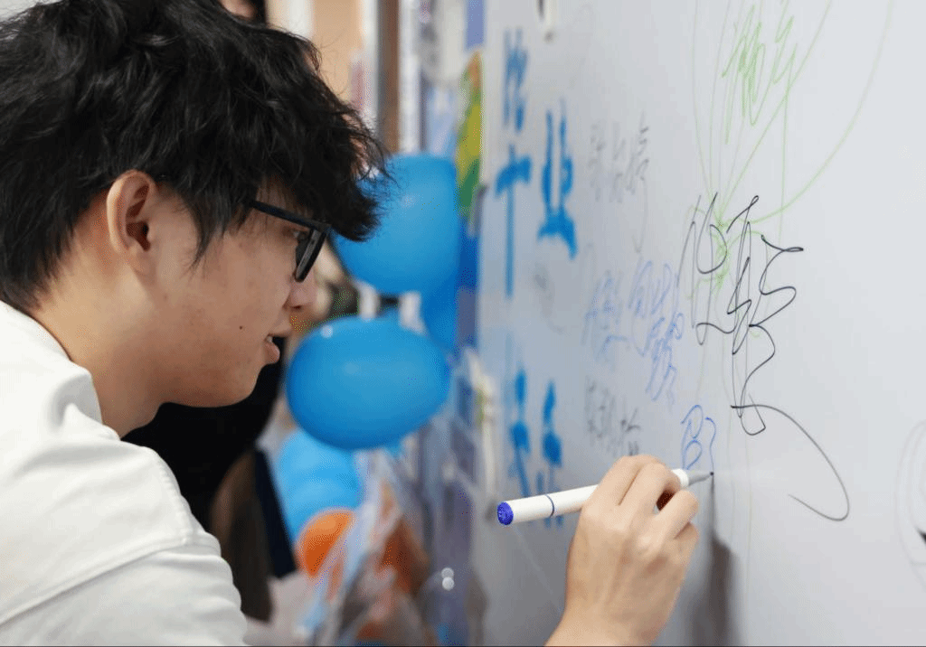 学生在打卡墙上签名