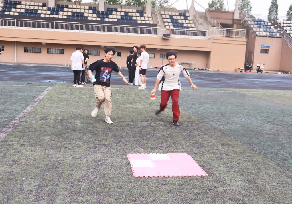 在最引人注目的趣味运动中,“竞速九宫格”趣味运动区成为全场焦点,方格状的地面上整齐摆放着三只彩色纸杯。随着哨声响起,参赛的两队同学如离弦之箭般快速冲刺,在九宫格间灵活穿梭,争分夺秒地调整纸杯位置,全神贯注地将三只纸杯摆成一条直线,率先完成的队伍将赢得这场充满速度与智慧的趣味比拼,围观人群不时爆发出阵阵笑声与欢呼声。
