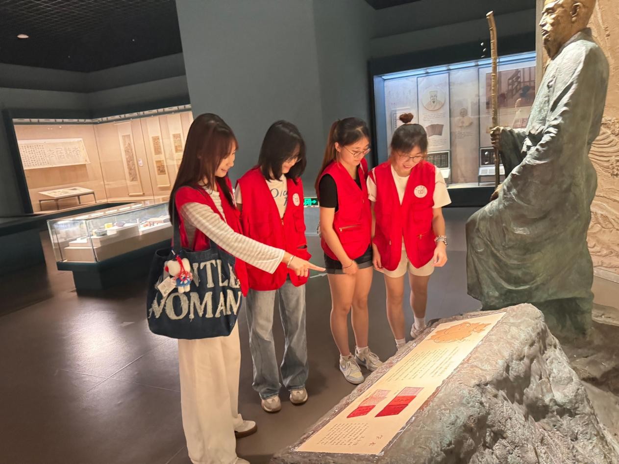 临海博物馆站,实践队员细致观览历史馆,考察王士性史料。一尊构思精巧的雕像引人注目:王士性拄杖前行,辅以“泽国”“山谷”“海滨”人群背景,其座镌刻生平与学术铭文。该作品凝练诠释了王士性作为“行走者”,以“人地关系”为基,托起“经世致用”之魂的精神内核。队员们俯身研读铭文,深入探寻王士性的地理学智慧。