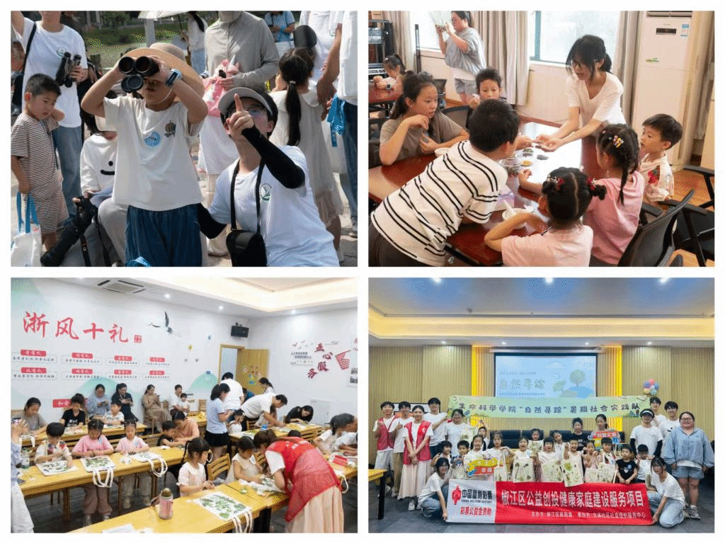 当下,加强生物多样性保护与生态文明建设成为社会共识和迫切需求。青少年作为未来建设者与生态文明传承者,其生态保护意识培育与自然启蒙至关重要。值此“两山”理念提出20周年之际,“自然寻踪”实践队积极响应习近平总书记“绿水青山就是金山银山”的科学论断,充分发挥科学教育、生物科学、环境生态工程等专业优势,与椒江文澜社区打造“创志社”志愿服务品牌深度合作,精心策划并组织实施了以“青少年生态意识培养”为核心的暑期社会实践活动。实践期间,队员们设计了内容丰富、形式多样的主题研学课程,包括鸟类生态探索、中草药香囊制作、植物拓印体验等,通过寓教于乐的互动方式,将生态知识、传统草药智慧与植物美学巧妙融合,激发了社区青少年探索自然、热爱自然的浓厚兴趣。活动赢得了青少年和社会的高度认可,并得到了“望潮”“青椒”等多家媒体的关注与报道。