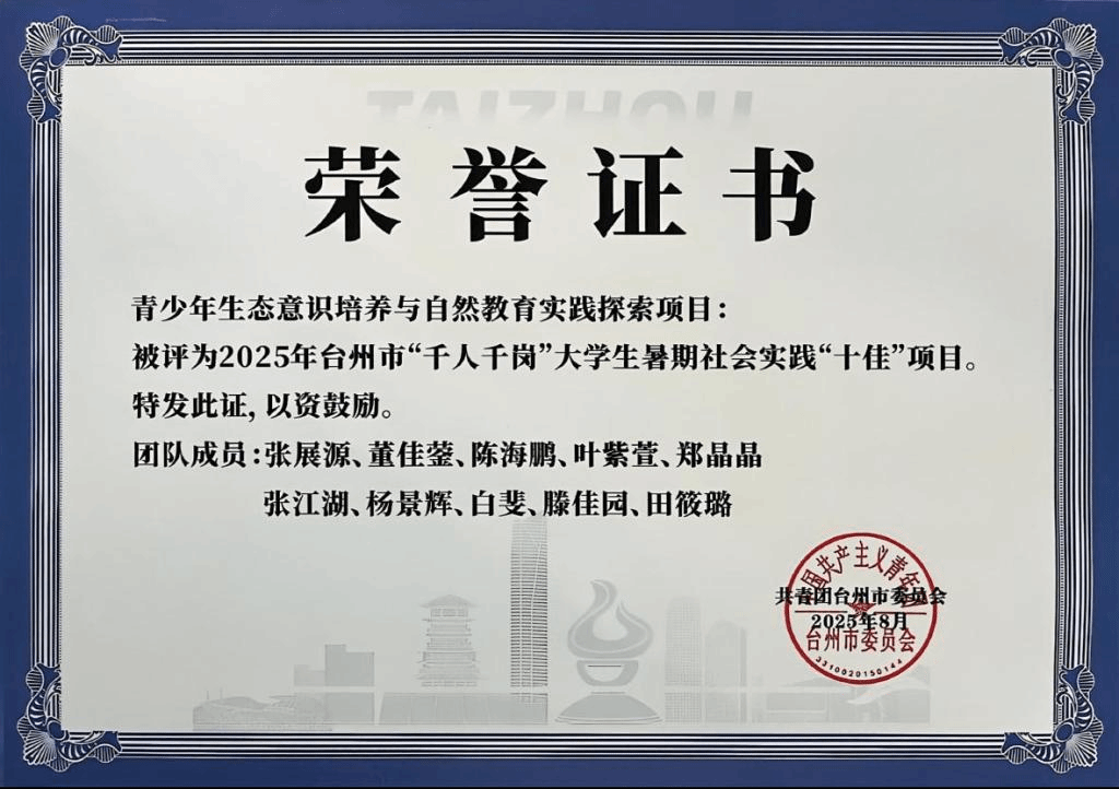 近日,共青团台州市委员会开展2025年“千人千岗”大学生暑期社会实践“百优”实习生、“十佳”项目、“优秀”项目、台州市青年社会实践示范基地评选,我校生命科学学院“自然寻踪”暑期社会实践队调研项目《青少年生态意识培养与自然教育实践探索》获评“十佳”项目荣誉称号。