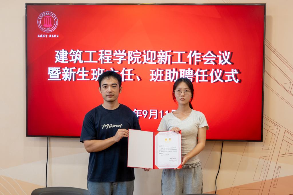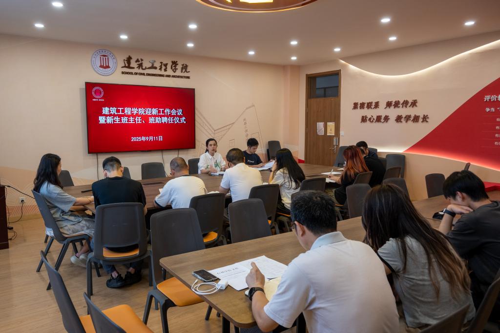 为做好2025级新生入学工作,9月11日,建工学院召开2025级迎新工作会议暨新生班主任、班助聘任仪式。学院党委副书记汤爽出席会议,各班班主任、班主任助理参加会议,会议由2025级新生辅导员薛军新主持。