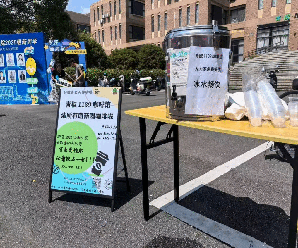 椒江校区创业团队“青椒1139咖啡馆”在迎新服务点免费提供冰水,并针对所有2025级新生开展凭录取通知书到店,可免费领取任意饮品一杯的优惠活动。