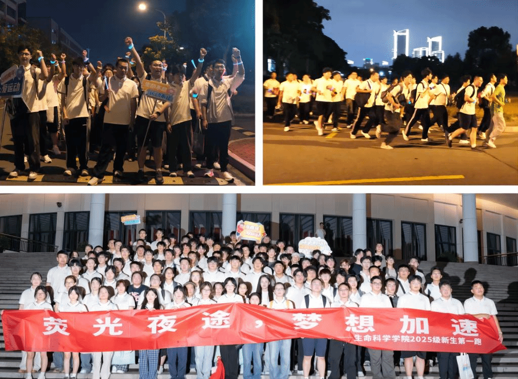 生命之美在于运动,青春之光在于绽放。迎新之夜,“2025级新生第一跑”活力开启,同学们手戴荧光环奔跑于校园,点点荧光如星河流动,笑容与脚步洋溢自信与朝气。这不仅是一场运动,也是一次温暖的相遇,更是大学健康习惯养成的动员号召,新生在奔跑中打开心扉、结识同行、强身健体,共赴发光的前程。