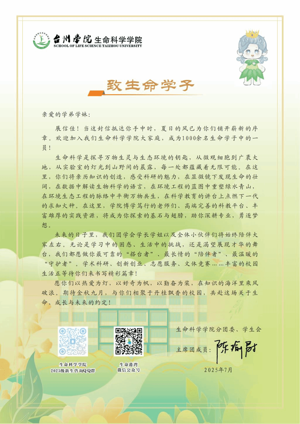 从高效有序的统筹协调,到温暖入微的师生互动;从筑牢根基的安全教育,到启智润心的思政领航;从学风建设的庄严启动,到榜样引领的成长对话——学院用“十个一”奋力践行“全员、全程、全方位”育人理念。愿所有“生命新绿”于此扎根生长、汲取养分,以青春之我、奋斗之我,在这片科学的沃土上勇敢追光,书写属于自己的生命华章。