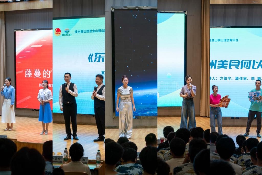 活动在《藤蔓的常青》中拉开帷幕。陈微、曹梦佳两位宣讲员深情讲述大陈岛垦荒史,诠释垦荒精神如何哺育代代台州人,点燃师生心中的红色基因与垦荒之魂;方朗宇、陈鑫以相声演绎“祖辈兄弟”分赴大陈岛与西北建设的感人故事,孙辈逗趣对话串起两段壮阔岁月,幽默中见庄重,令人肃然起敬;顾佳雨化身三个时代“新型轴承”,以拟人化的方式带领大家走进新能源汽车、航天科技与人形机器人的科技前沿。从小小“轴承”切入,诠释“新质生产力”的宏大内涵;李璐以名为肖义的青年的成长缩影,映照台州搭平台、深校企,助青年与城市共进、与时代同频的生动图景;方朗宇、顾佳宇、李璐、杨胜杰四位宣讲员通过直播的形式“带货”台州味感受台州情,一句“鲜哒哒、糯叽叽、辣呵呵、甜蜜蜜”把黄琅青蟹、梅花糕、姜汤面、枇杷露喊成爆款,瞬间使得新生心生向往。