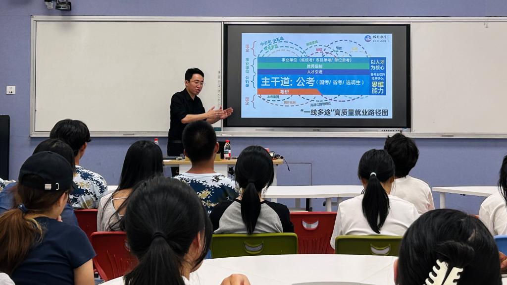 为帮助学生明晰就业方向,拓宽职业发展视野,9月18日,商学院在6-101教室开展“一线多途”高质量就业选择专题讲座。本次活动特邀砺行教育联合创始人祝文峰主讲,吸引了60余位各专业学生代表到场参加。