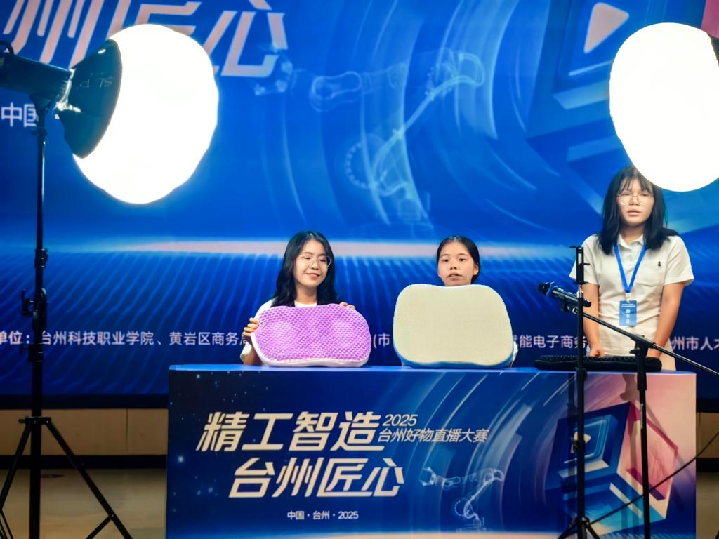 决赛采用“5分钟模拟直播”赛制。在赛前产品抽签中,我校参赛团队抽到“汽车坐垫”这一选题,面对几乎全是专业主播的竞争对手,在仅两小时的备稿时间内,团队成员高效协作,反复演练脚本、打磨话术,上场后三人默契配合,将汽车坐垫的工艺细节与使用场景生动呈现,最终荣获“台州好物推荐官”称号。