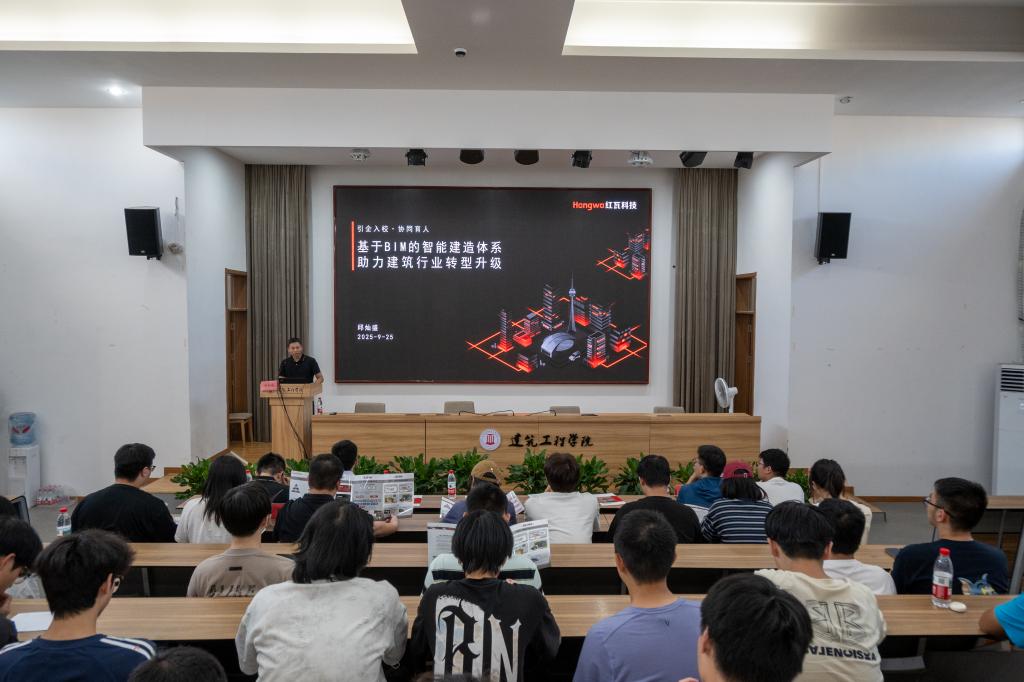 捐赠仪式后,邱灿盛为在场师生带来了题为《基于BIM的智能建造体系助力建筑行业转型升级》的专题讲座。他从智能建造体系的构建路径、行业应用案例到未来趋势进行深入讲解,结合企业实践经验,分享了对行业发展的思考。讲座内容紧贴行业前沿,现场同学们认真聆听,气氛热烈。
