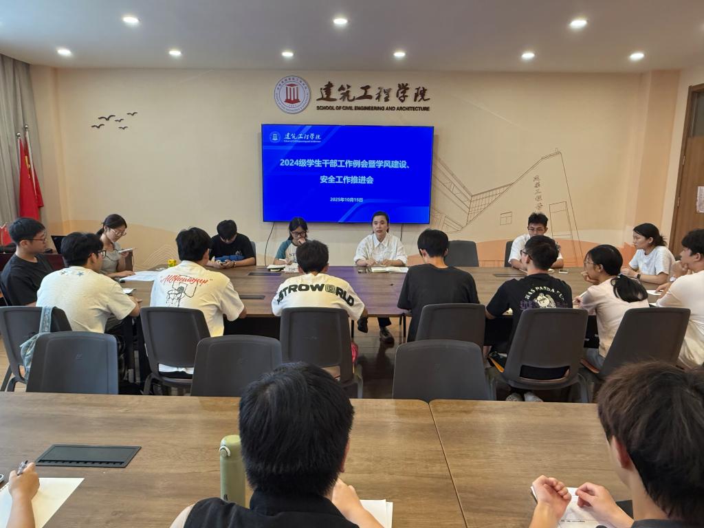 为持续加强和改进学风建设,筑牢校园安全防线,10月15日,建筑工程学院召开2024级学生干部工作例会暨学风建设、安全工作推进会。会议由学院党委副书记、2024级辅导员汤爽主持,2024级各班主要学生干部参加会议。