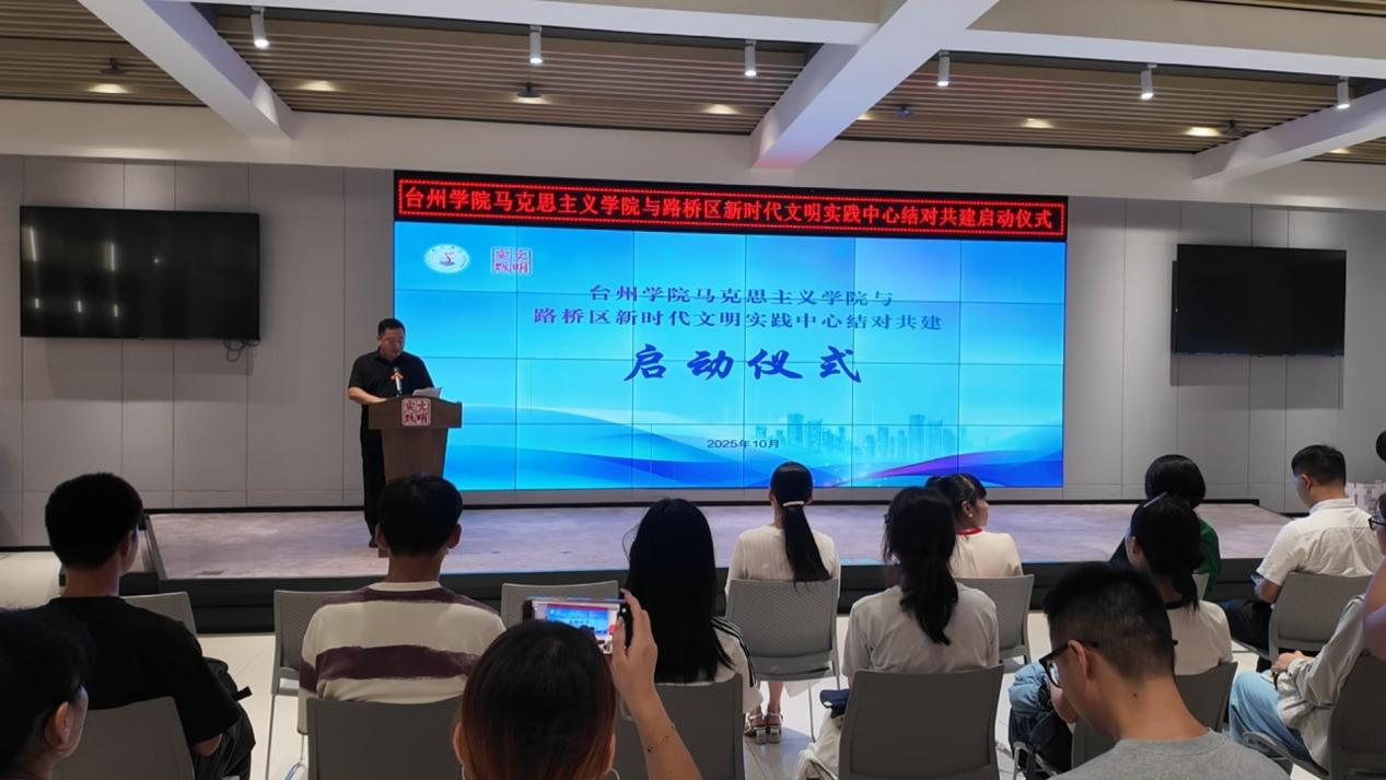 10月17日下午,为深入贯彻落实《全省高校马克思主义学院和新时代文明实践中心共建行动方案》精神,马克思主义学院与路桥区新时代文明实践中心结对共建启动仪式在路桥区新时代文明实践中心举行。学院院长张天华、党总支书记王胜、副院长王在亮,路桥区委宣传部副部长徐玮玮、区精神文明建设指导中心主任许美颖等领导共同参与活动,旨在推动高校智力资源与地方实践需求精准对接,深化校地合作,让党的创新理论扎根基层。路桥区各新时代文明实践所(站)工作人员代表、马学院师生代表参与调研活动。