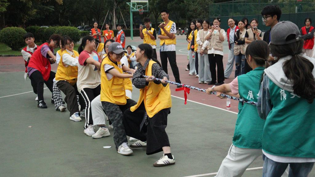 游戏环节设为“热身运动”“齐心协力”“默契考验”和“体脑对决”,采用积分制。主持人宣布规则后,各组在组长带领下,讨论战术,默契配合,充分展现了团队精神。其中,“巨人脚步”和“摸着石头过河”考验参与者的灵活性;“球行万里”与“螃蟹赛跑”重在沟通协作;最后的“拔河”项目彰显了团队合作的力量。现场气氛热烈,欢呼不断。在“球行万里”中,大家屏息凝神,小心翼翼地传递每一个乒乓球;“拔河”时大家更是拼尽全力,心往一处想,劲往一处使。整个过程中不仅提升了学生间的默契度,也增进了彼此的信任,在轻松愉快的氛围中进一步强化了团队凝聚力。