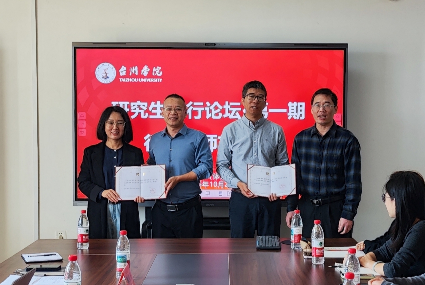 会议伊始,学院为两位导师颁发聘书,正式聘任他们为研究生行业导师。