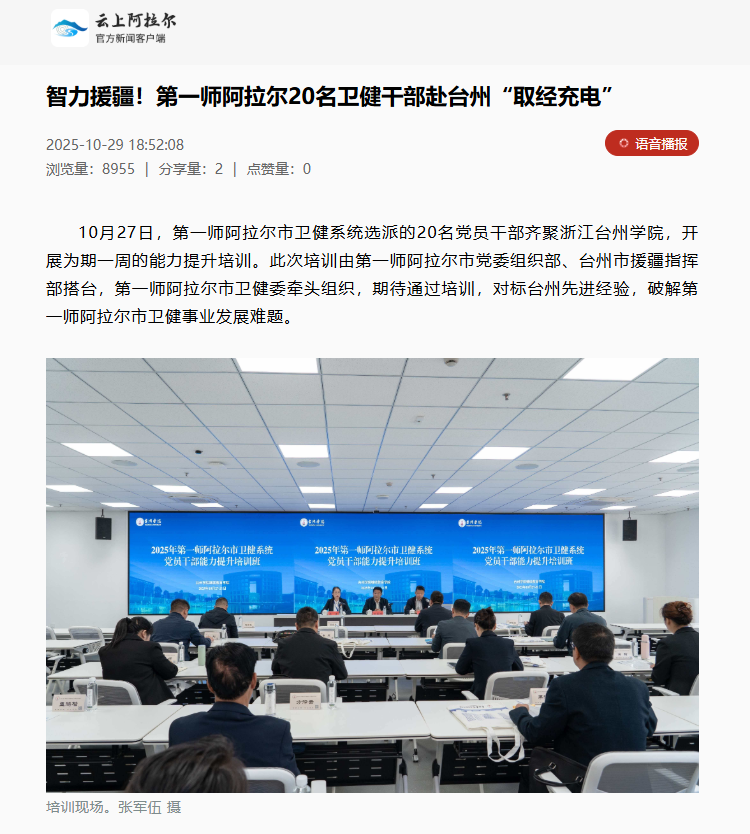 10月27日,第一师阿拉尔市卫健系统选派的20名党员干部齐聚我校,开展为期一周的能力提升培训。新疆生产建设兵团第一师阿拉尔市卫健系统发布专题报道,详细记录了其选派干部在我校圆满完成培训的历程与收获。报道中对我校的培训组织与服务工作给予高度赞誉,这既是一份跨越千里的信任,也是对我校社会服务能力的充分肯定。