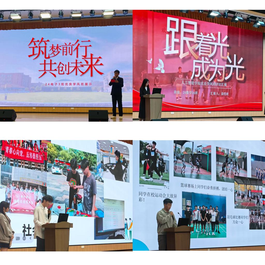 评选现场,通过精心准备的PPT,各班展示了在学风建设方面的举措与成果。内容涵盖课堂出勤率、席卡摆放、抬头率、学业平均绩点、科研成果、学科竞赛获奖、帮扶小组运行、班级特色活动等多个维度。一个个亮眼的成绩、一项项创新的举措、一幕幕团结互助的场景,充分展现了AI学子笃实好学、积极向上的精神风貌。
