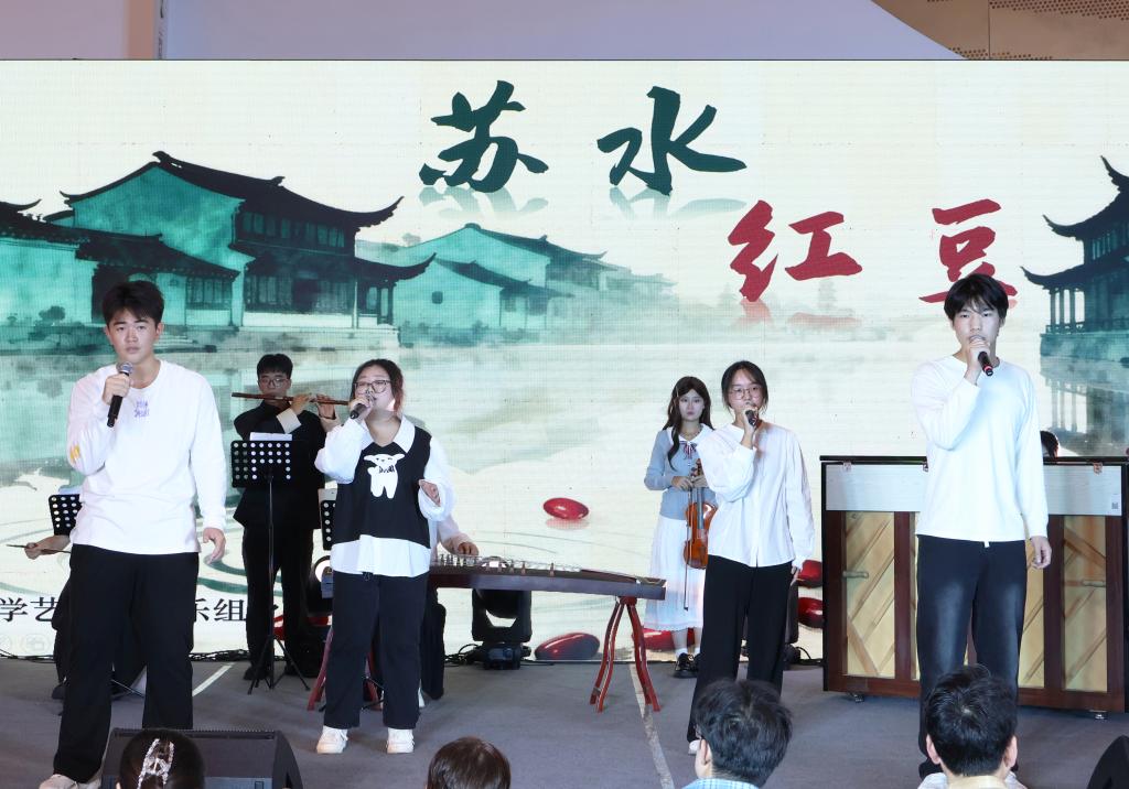 压轴篇章“仁风载道,韶华织梦”韵味悠长。越剧《红楼梦・黛玉葬花》选段以精湛扮相与婉转唱腔展现传统艺术魅力;朗诵合唱《倔强》激昂坚定,道出医学生“永不言弃”的铮铮誓言;最终,声乐组《苏水・红豆》以悠扬旋律为整场演出画上圆满句号,余音袅袅,暖意长存。
