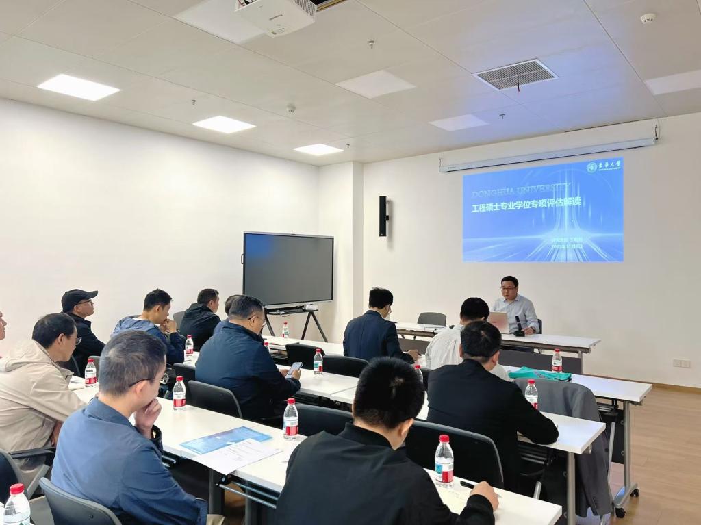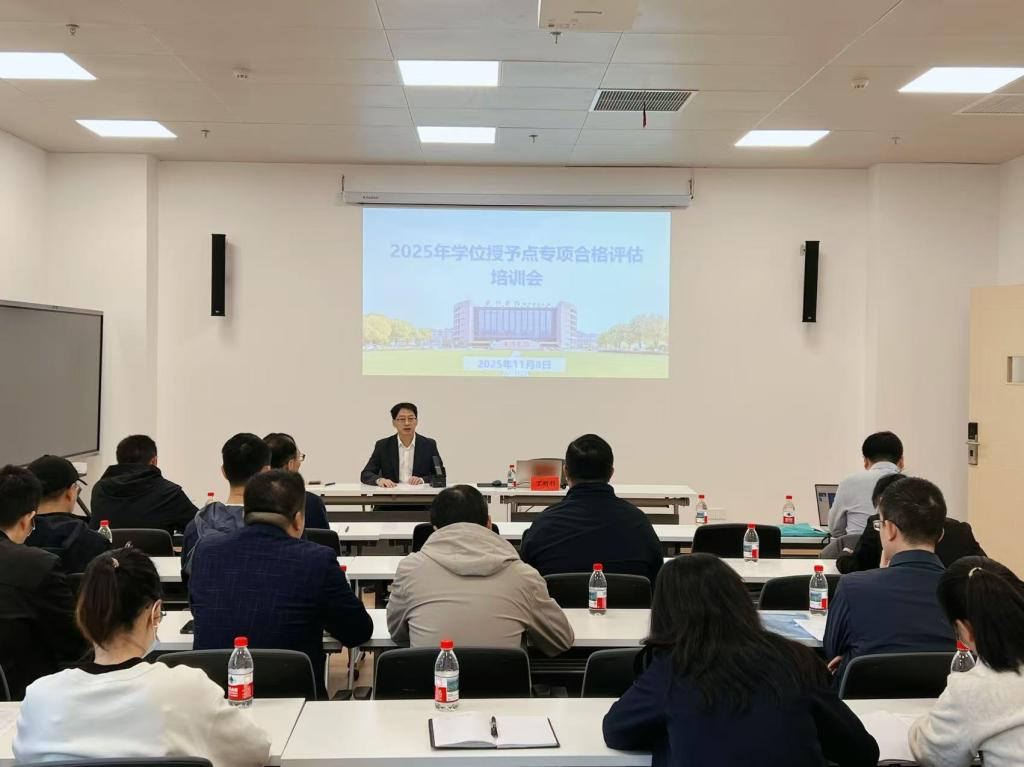 11月8日上午,我校在科技综合楼206会议室召开2025年学位授予点专项合格评估工作培训会。特邀东华大学研究生院副院长丁明利作《工程硕士专业学位专项评估解读》专题讲座。会议由研究生院院长朱流主持,各相关研究生培养学院分管副院长、学位授权点负责人、研究生秘书及骨干教师,研究生院全体成员参加。